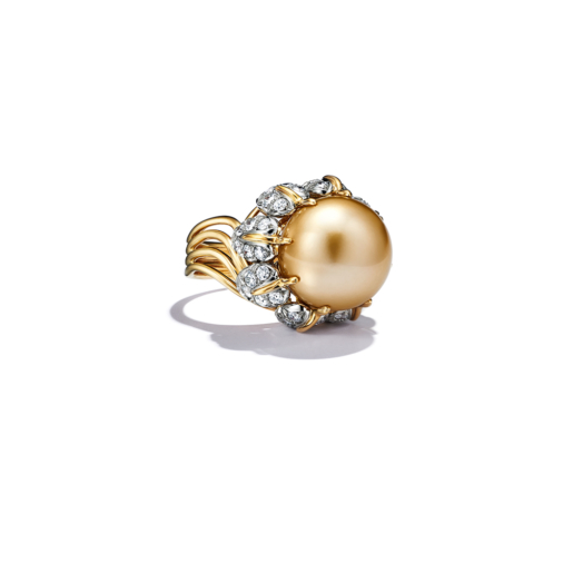 Tiffany & Co. Schlumberger® Inverted Petals ring in 18k yellow gold and platinum with a cultured South Sea golden pearl and diamonds.