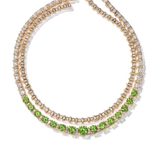 Necklace in 18k yellow gold with esteemed Russian demantoid garnets and diamonds. Convertible piece.