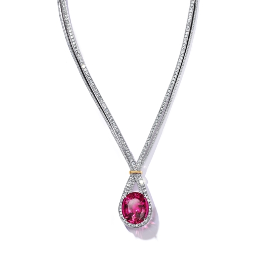 Pendant in platinum and 18k yellow gold with a rubellite of over 69 carats and diamonds of over 44 total carats.