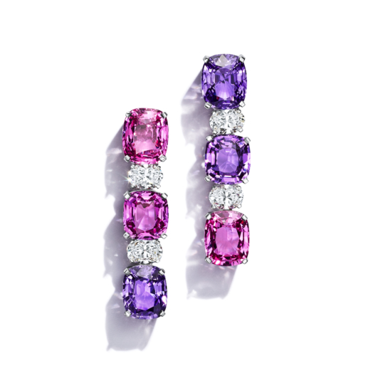 Earrings in platinum with unenhanced pink and purple sapphires and diamonds