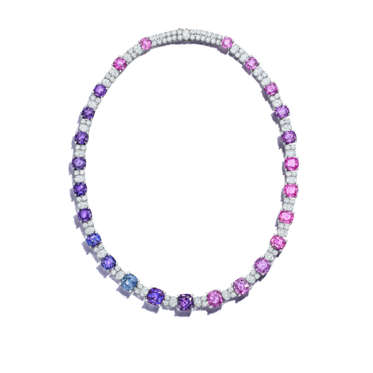 Necklace in platinum with unenhanced pink and purple sapphires, an unenhanced fancy sapphire and diamonds.