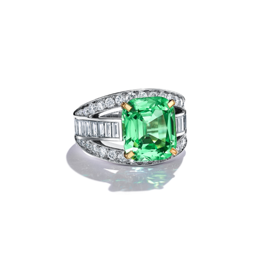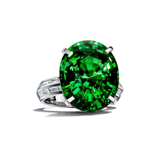 Ring in platinum with a tsavorite, over 15 carats and diamonds.