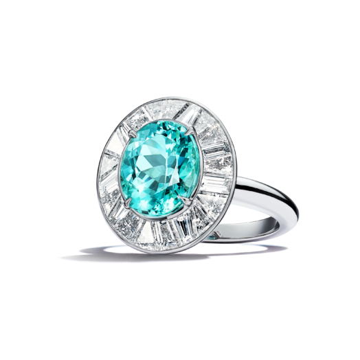 Ring in platinum with a blue cuprian elbaite tourmaline and diamonds.