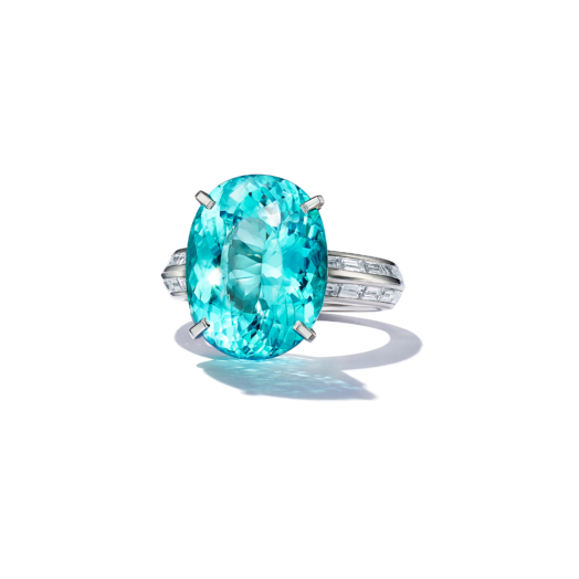 Ring in platinum with a blue cuprian elbaite tourmaline, over 9 carats and diamonds.