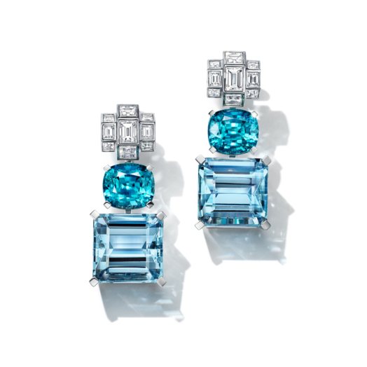 Earrings in platinum with aquamarines, blue zircons and diamonds.