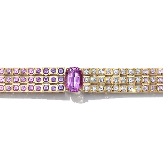 Bracelet in 18k yellow gold with a pink topaz, over 18 carats, purple to pink sapphires and diamonds.