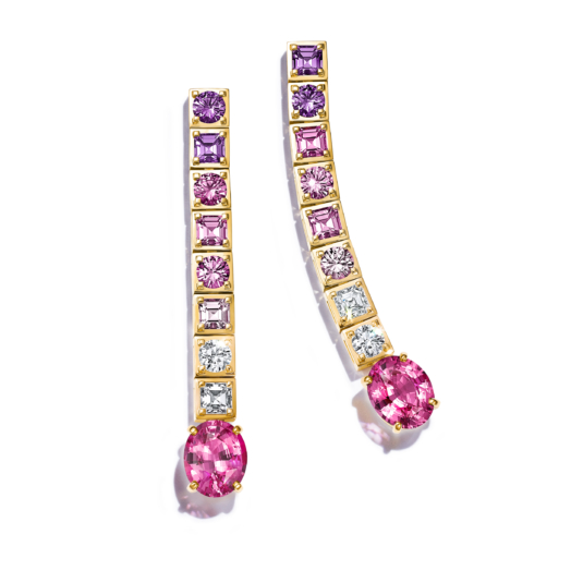Earrings in 18k yellow gold with pink sapphires, purple to pink sapphires and diamonds.