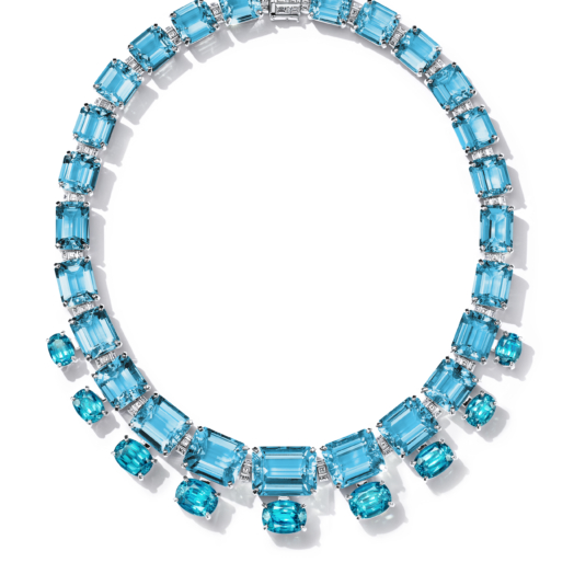 Necklace in platinum with aquamarines, blue zircons and diamonds.