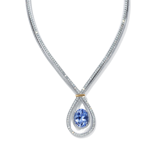 Pendant in platinum and 18k yellow gold with an unenhanced purple cuprian elbaite tourmaline, over 28 carats and diamonds.