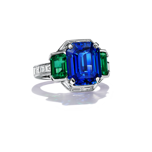 Ring in platinum with an esteemed Sri Lankan Tiffany & Co. sapphire, over 7 carats, emeralds and diamonds.