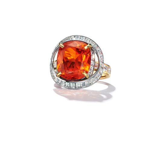 Ring in platinum and 18k yellow gold with a spessartine, over 9 carats and diamonds.