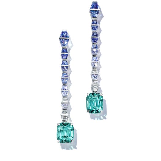 Earrings in platinum with blue tourmalines, sapphires and diamonds.