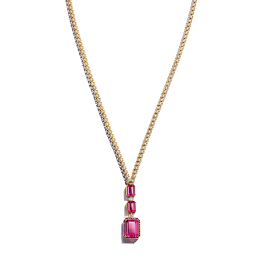 Pendant in 18k yellow gold with rubellites, over 30 total carats and diamonds.