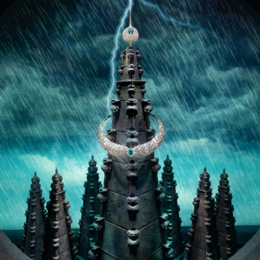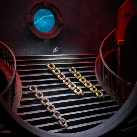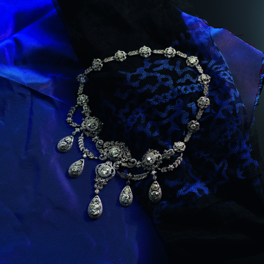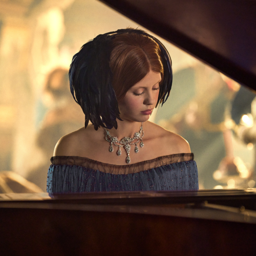 Mia Goth as Elizabeth wearing an archival necklace made of gold, platinum and diamonds.