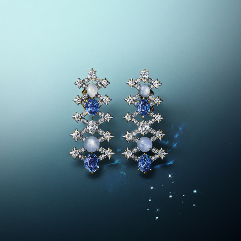 Earrings in platinum and 18k yellow gold with unenhanced esteemed Sri Lankan sapphires of over 8 total carats, star sapphires and diamonds from Blue Book 2024: Tiffany Céleste.