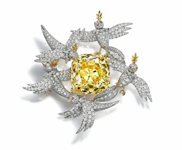 The Tiffany Diamond Gold, platinum, diamonds, yellow diamond, pink sapphires 1878 (The Tiffany Diamond); 2022 (setting). Mar 14, 2024