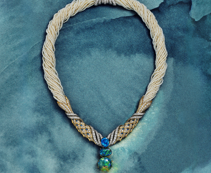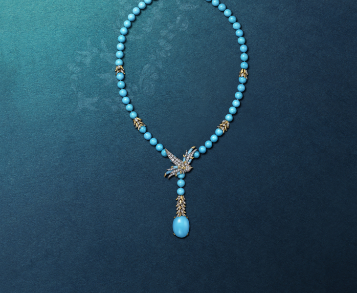Bird on a Rock by Tiffany lariat in platinum and 18k yellow gold with a turquoise drop of approximately 16 carats, 54 turquoise beads, turquoise accents, diamonds and rubies Oct 2, 2025