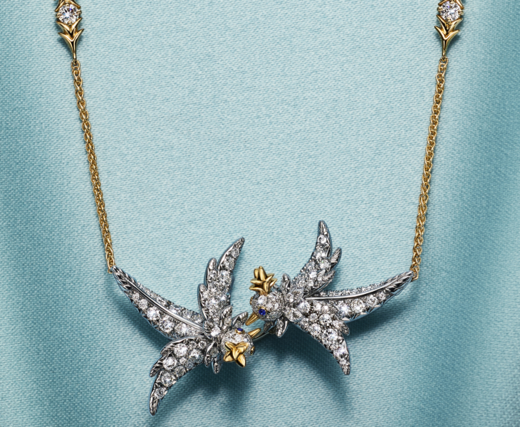 Bird on a Rock by Tiffany pendant in platinum and 18k yellow gold with diamonds and sapphire accents. Oct 2, 2025