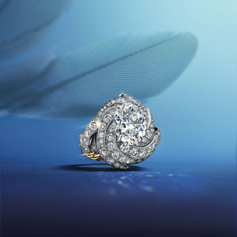 Ring in platinum and 18k yellow gold with a diamond of over 6 carats and diamond accents from Blue Book 2024: Tiffany Céleste.