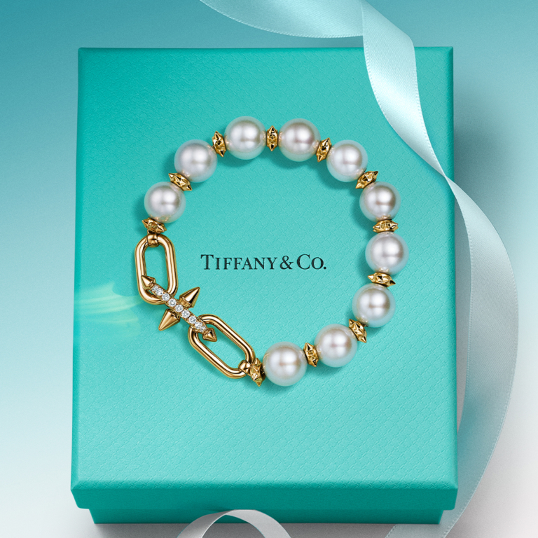 Tiffany Titan by Pharrell Williams pearl bracelet in 18k yellow gold with diamonds.